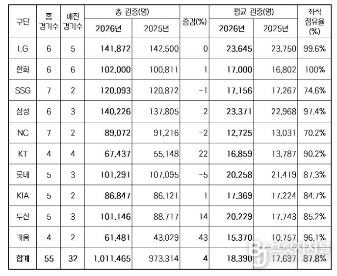 브릿지저널 김경미 기자 | 2026 신한 SOL KBO 리그가 오늘(10일) 열린 잠실, 고척, 수원, 대전, 대구 경기에 총 9만 1,459명이 입장하며 100만 관중을 달성했다.