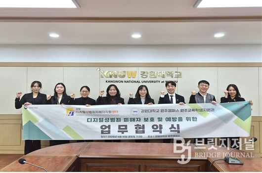 브릿지저널 윤나영 기자 | 강원특별자치도와 강원디지털성범죄피해자지원센터는 디지털 성범죄가 없는 안전한 캠퍼스 조성을 위해 4월 10일 강원대학교 원주캠퍼스 원주교육학생지원과와 디지털성범죄 피해자 보호 및 지원 강화를 위한 업무협약(MOU)을 체결했다.