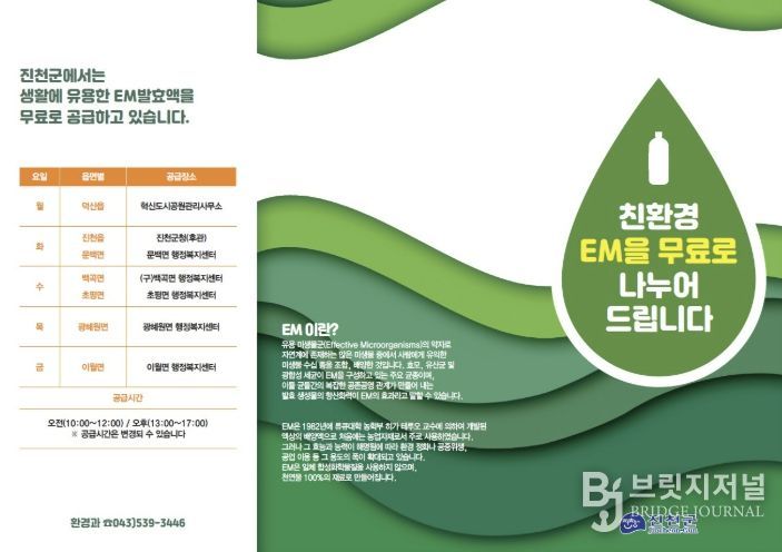 브릿지저널 김경미 기자 | 충북 진천군은 4월부터 악취 제거와 수질 정화에 효과가 있는 친환경 EM 발효액을 무상으로 보급하고 있다고 13일 밝혔다.