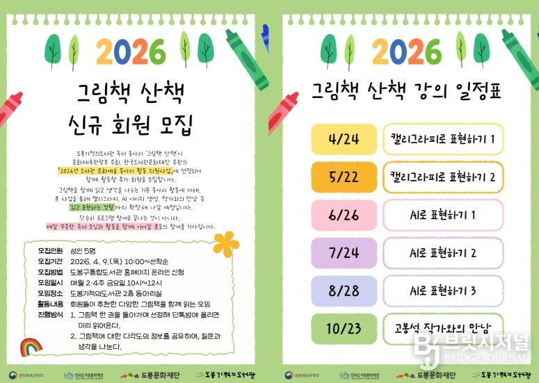 브릿지저널 김경미 기자 | 서울 도봉구 도봉기적의도서관이 독서동아리 ‘그림책 산책’을 확대 운영한다. ‘그림책 산책’은 그림책을 함께 읽고 이야기를 나누는 성인 독서 동아리다. 앞서 도서관은 문화체육관광부와 한국도서관문화재단이 추진하는 녪년 도서관 문화예술 동아리 활동 지원사업’에 선정됐다.