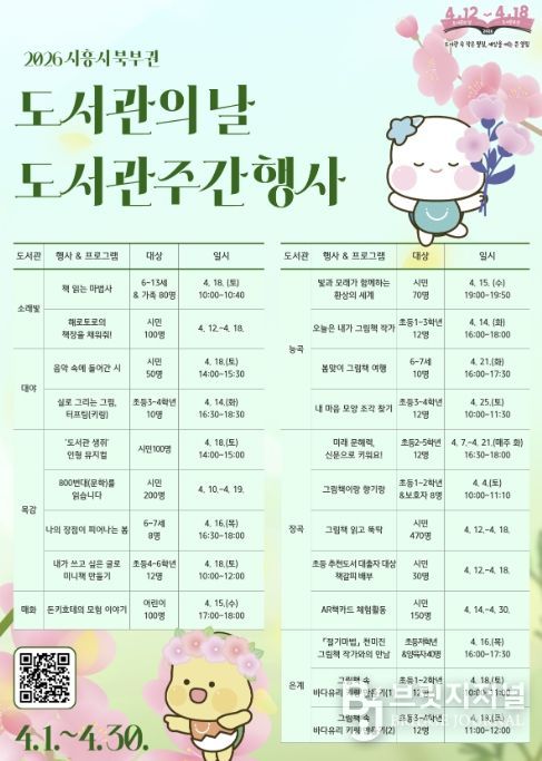 브릿지저널 김경미 기자 | 시흥시 북부권 공공도서관은 4월 12일 ‘도서관의 날’과 4월 12일부터 18일까지 이어지는 ‘도서관주간’을 기념해 다양한 독서문화 행사와 현장 참여 이벤트를 4월 한 달간 운영한다.