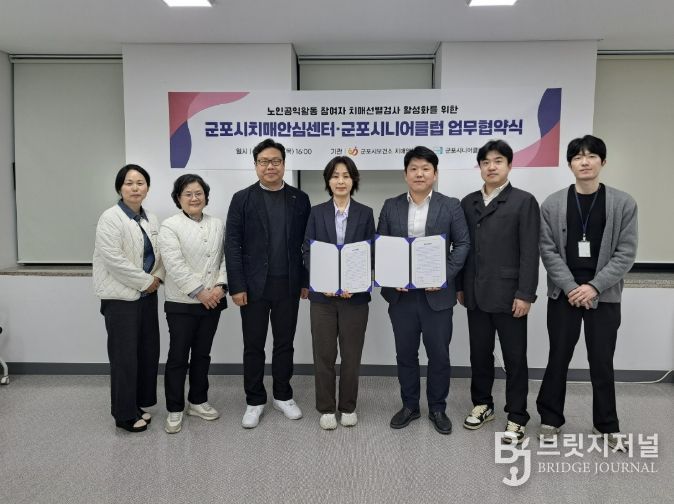 브릿지저널 김경미 기자 | 군포시치매안심센터는 4월 9일 군포시시니어클럽과 업무협약을 체결하고 노인공익활동 참여자를 대상으로 한 치매선별검사 확대에 나선다고 밝혔다.