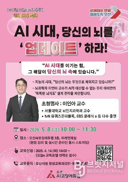 브릿지저널 김경미 기자 | 오산시는 오는 5월 8일 오전 10시 오산AI코딩에듀랩에서 『AI시대, 당신의 뇌를 ‘업데이트’하라!』를 주제로 명사 초청 디지털 AI 시민 특강을 개최한다고 밝혔다.