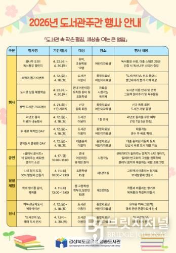 브릿지저널 정보영 기자 | 경상북도교육청 청송도서관이 2026년 4월 도서관주간을 맞이하여 ‘도서관 속 작은 펼침, 세상을 여는 큰 열림’을 주제로 다양한 독서·문화 프로그램을 운영한다.