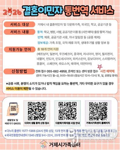 브릿지저널 김경미 기자 | 거제시가족센터는 결혼이민자 및 외국인의 언어 장벽 해소와 안정적인 지역사회 정착을 지원하기 위해 무료 통·번역 서비스를 한층 확대해 시행하고 있다고 밝혔다.