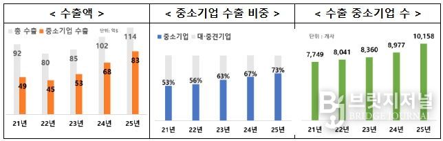 한편, 중소기업의 화장품 수출 규모는 2022년 44.7억 달러에서 2023년, 2024년에는 각각 53.2억달러, 68.5억 달러로, 그리고 2025년에는 83.2억 달러로 늘면서 매년 평균 23% 가까운 성장세를 이어오고 있다. 올해도 지난 2월까지의 수출액이 약 14억 달러로 이미 지난해 같은 기간의 수출액을 넘어서면서 이러한 흐름은 앞으로도 계속될 전망이다.