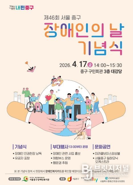 브릿지저널 김경미 기자 | 서울 중구가 오는 17일 오후 2시, 중구구민회관 3층 대강당에서 '제46회 장애인의 날 기념식'을 개최한다.