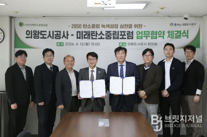 브릿지저널 김경미 기자 | 의왕도시공사가 4월 13일 (사)미래탄소중립포럼과 ‘2050 탄소중립 녹색성장 실현’을 위한 업무협약을 체결하고, 지속 가능한 지역사회 조성을 위한 협력 기반을 마련했다.