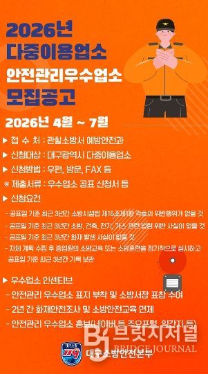 브릿지저널 김진석 기자 | 대구소방안전본부는 시민들이 안심하고 이용할 수 있는 환경을 조성하고, 영업주의 자율적인 안전관리 의식을 높이기 위해 ‘2026년 다중이용업소 안전관리 우수업소’ 신청을 접수한다.