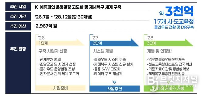 브릿지저널 김경미 기자 | 교육부는 전국 17개 시도교육청과 학교에서 사용하는 케이(K)-에듀파인의 재해복구 체계를 구축하고 운영환경을 고도화하는 사업을 본격 추진한다고 밝혔다.
