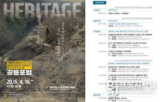 브릿지저널 윤나영 기자 | 국립문화유산연구원-광역자치단체 문화유산 연구기관 협의체(경기문화재단경기역사문화유산원, 경남연구원경남학연구센터, 경북문화재단문화유산원, 전라남도문화재단국가유산연구소, 충남역사문화연구원, 충청북도역사문화연구원)는 2026년 4월 16일 수요일 「국가유산 기후위기 돌파구, 국가와 지역의 협력에서 찾다」를 주제로 청주 오스코에서 공동 포럼을 개최한다.