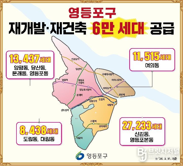 브릿지저널 김경미 기자 | 영등포구가 관내 재개발‧재건축 사업을 통해 총 6만 세대 규모의 주택 공급을 추진하며, 서울 도심 속 명품 주거단지 조성에 박차를 가하고 있다고 밝혔다.