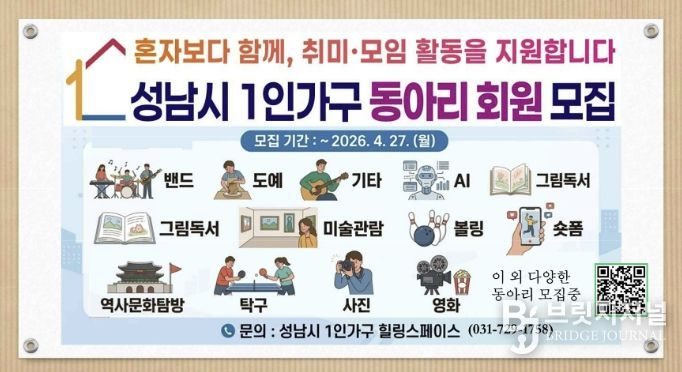 브릿지저널 김경미 기자 | 성남시는 같은 취미를 가진 1인 가구들로 구성된 동아리에 연간 최대 70만원의 활동비를 지원한다고 15일 밝혔다.