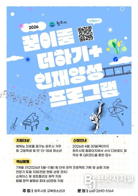 브릿지저널 윤나영 기자 | 원주시는 예체능 분야에 재능 있는 청소년들이 전문가와 함께 작품을 제작하고, 자신의 진로를 구체화할 수 있도록 ‘꿈이룸 더하기+ 인재양성 프로그램’ 참여자를 모집한다.