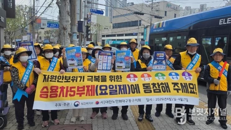 브릿지저널 김진석 기자 | (사)대한노인회 대구동구지회와 신암뜨란채·서한3차봉사단은 지난 14일, 대구공고 네거리와 혁신대로에서 ‘에너지 절약 및 대중교통 이용 합동 캠페인’을 전개했다.