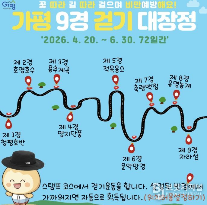 브릿지저널 김경미 기자 | 가평군의 수려한 자연경관을 배경으로 건강을 다지는 ‘2026 가평 9경 걷기 대장정’이 오는 20일부터 시작된다. 가평군보건소는 군민들의 비만을 예방하고 걷기 실천율을 높이기 위해 이번 프로그램을 마련했다고 15일 밝혔다.