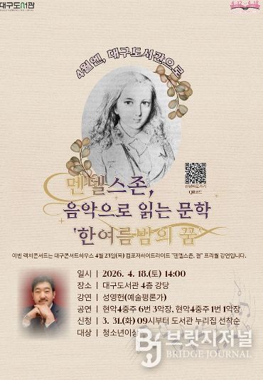 브릿지저널 김진석 기자 | 대구도서관은 4월 도서관 주간을 맞아 대구콘서트하우스와 협업해 특별 렉처콘서트 ‘멘델스존 음악으로 읽는 문학’을 4월 18일 오후 2시에 개최한다.