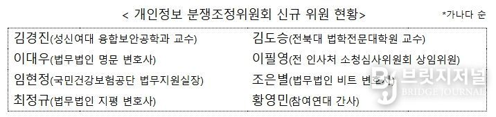 브릿지저널 김경미 기자 | 개인정보보호위원회는 개인정보 분쟁조정위원회(위원장 강영수, 이하 ‘분쟁조정위’)의 위원 8명을 신규 위촉했다. 위촉기간은 ’26. 4. 15.부터 ’28. 4. 14.까지 2년간이다.