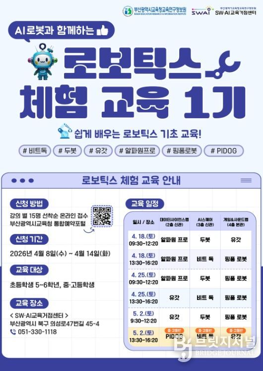 브릿지저널 윤나영 기자 | 부산광역시교육청교육연구정보원은 오는 18일부터 5월 2일까지 6회에 걸쳐 부산SW·AI교육거점센터에서 초등 5~6학년, 중·고등학생 90명을 대상으로 ‘AI로봇과 함께하는 로보틱스 체험 교육’을 운영한다.