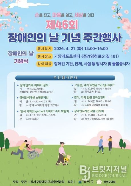 브릿지저널 김경미 기자 | 서울 강서구는 4월 20일 장애인의 날을 맞아, 오는 18일부터 일주일간 ‘제46회 장애인의 날 기념 주간행사’를 개최한다고 밝혔다.