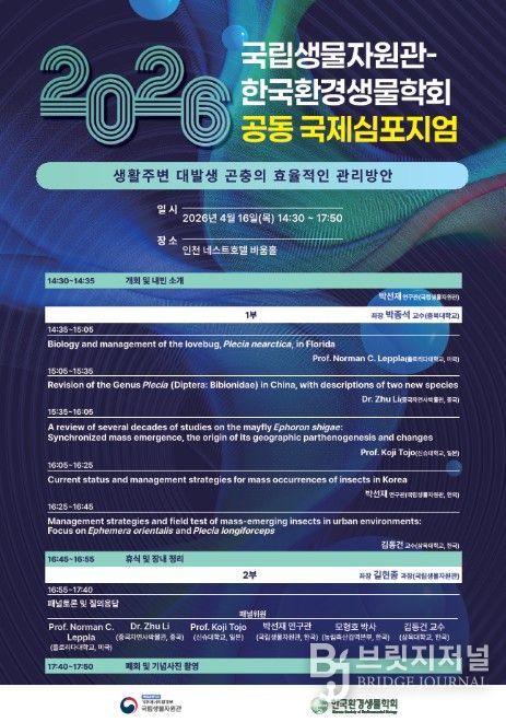 브릿지저널 김경미 기자 | 기후에너지환경부 소속 국립생물자원관은 환경생물학회와 공동으로 4월 16일 오후 네스트호텔(인천시 영종도 소재)에서 ‘생활주변 대발생 곤충의 효율적인 관리방안’이라는 주제로 국제학술토론회(심포지엄)를 개최한다고 밝혔다.