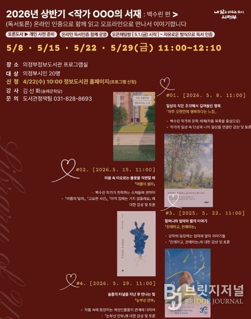 브릿지저널 김경미 기자 | 의정부시는 2026년 상반기 ‘작가 OOO의 서재: 백수린 편’을 5월 매주 금요일(8일, 15일, 22일, 29일) 총 4회에 걸쳐 의정부정보도서관에서 운영한다.