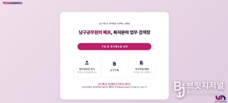 브릿지저널 윤나영 기자 | 부산 남구는 복지행정의 업무 효율성을 높이고 민원 응대 품질을 개선하기 위해 남구 베스트 복지행정 프로젝트인 ‘베프 AI챗봇’을 4월 중 구축하고 시범운영을 시작했다고 밝혔다.