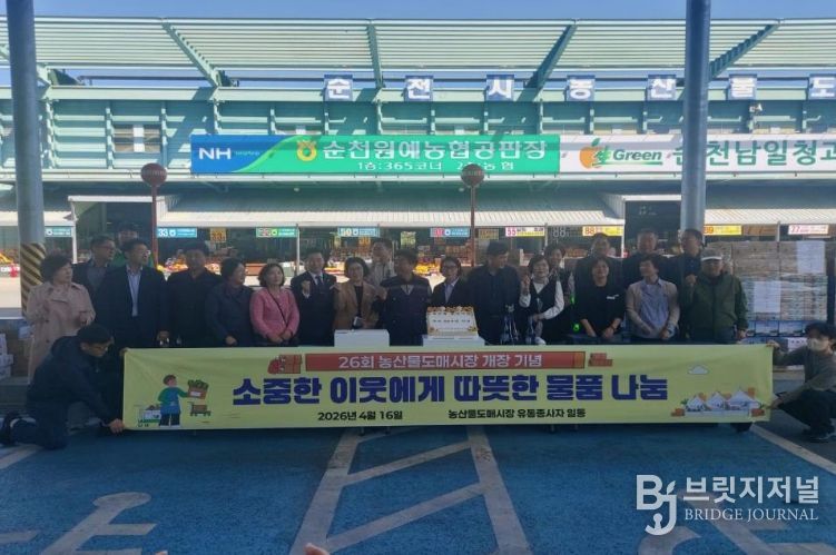 브릿지저널 김경미 기자 | 순천시농산물도매시장은 16일 개장 26주년(개장일 2001년 4월 18일)을 맞아 기념행사 대신 지역사회를 위한 따뜻한 나눔 활동을 펼쳤다.