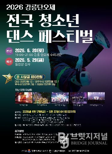 브릿지저널 윤나영 기자 | 강릉시 청소년수련관은 오는 6월 20일 오후 7시 강릉단오제 수리마당에서 개최되는 ‘2026 강릉단오제 전국 청소년 댄스 페스티벌’의 참가팀을 17일부터 5월 27일까지 모집한다.