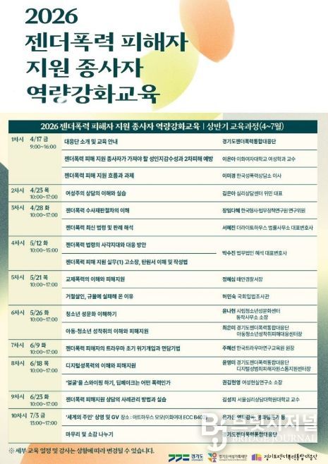 브릿지저널 김경미 기자 | 경기도와 경기도젠더폭력통합대응단이 17일 도내 젠더폭력 피해 지원 현장 종사자들의 전문성 향상을 위한 ‘2026 역량강화 교육’ 상반기 과정을 시작하며 현장 대응력 강화에 나섰다.