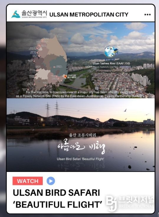 브릿지저널 윤나영 기자 | 울산시는 ‘울산 조류사파리’홍보영상이 국제철새기구 공식관계망(채널)을 통해 전 세계에 소개되며 세계적(글로벌) 생태도시 울산 알리기가 본격 시작됐다고 밝혔다.