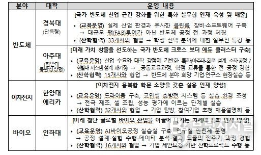 이번 성과교류회는 첨단산업 특성화대학의 특성화 전공 운영, 다각적 기업 협업, 학사 운영 개선 등 성공 사례를 확산하기 위하여 마련됐다. 올해는 경북대(반도체 단독형), 아주대(반도체 동반성장형), 한양대 에리카(이차전지), 인하대(바이오) 등 4개 대학이 우수 성과를 발표한다.