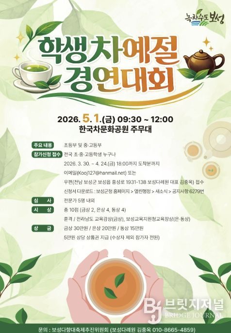 브릿지저널 김경미 기자 | 보성군은 오는 24일 18시까지 ‘2026 학생차예절경연대회’에 참가할 전국 초·중·고등학생을 모집한다고 밝혔다.