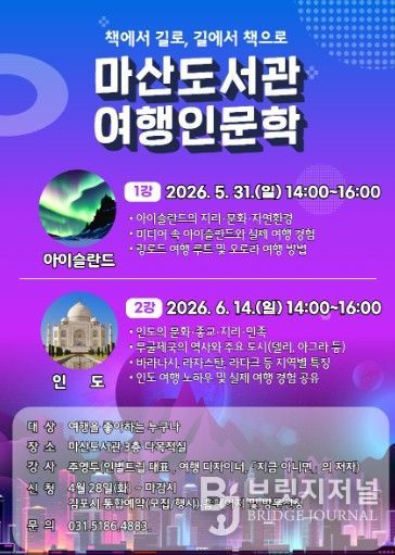 브릿지저널 김경미 기자 | 김포시 마산도서관이 오는 5월 31일과 6월 14일 오후 2시부터 4시까지 다목적실에서 여행 인문학 강연 ‘책에서 길로, 길에서 책으로’를 운영한다.