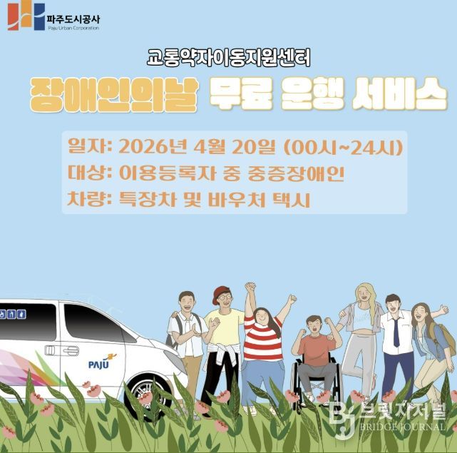 브릿지저널 김경미 기자 | 파주도시공사 교통약자이동지원센터에서는 오는 4월 20일 장애인의 날을 맞아 교통약자를 위한 무료 운행 서비스를 실시한다.