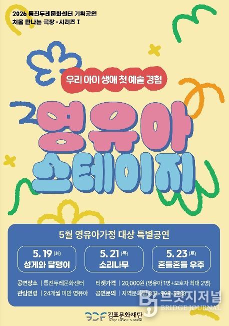 브릿지저널 김경미 기자 | 김포문화재단은 오는 5월 가정의 달을 맞아 통진두레문화센터 특별 기획으로 24개월 미만 영유아를 위한 체험형 공연 시리즈 '처음 만나는 극장 - 영유아 스테이지'를 선보인다.