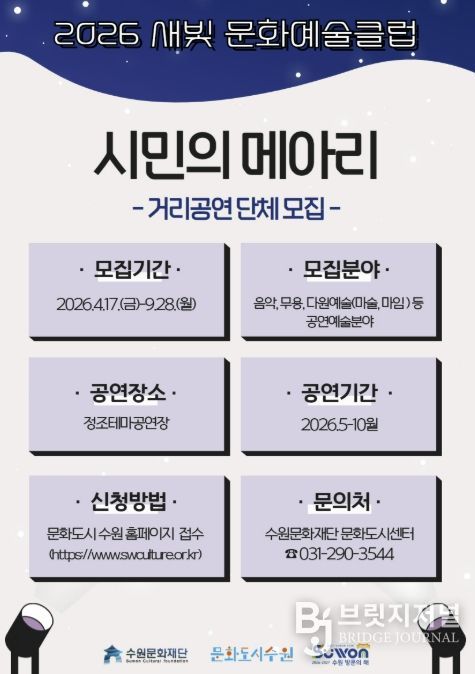 브릿지저널 김경미 기자 | 수원문화재단은 지역 공연예술의 활성화와 수원시민의 주체적 문화예술 참여를 위해 ‘새빛 문화예술클럽 '시민의 메아리'’ 사업에 참여할 생활예술단체를 모집한다.