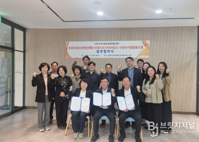브릿지저널 김경미 기자 | 수원시 도서관사업소와 수원시청소년청년재단, 수원시서점협동조합이 지역 독서문화 활성화와 시민 독서활동 증진을 위해 협력하기로 했다.