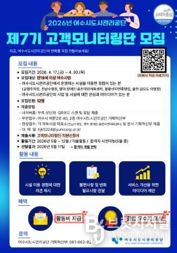 브릿지저널 김경미 기자 | 여수시도시관리공단은 시민 참여를 기반으로 공단 시설과 서비스 품질을 점검하고 개선하기 위한 '2026년 제7기 고객모니터링단'을 모집한다고 밝혔다.