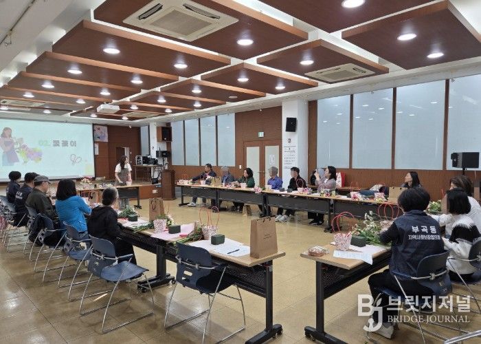 부곡동주민센터에서 열린 1회차 프로그램에서는 참여자 간 어색함을 해소하고 친밀감을 높이기 위해 자기소개 시간을 시작으로 꽃꽂이 체험이 진행됐다. 참여자들은 꽃을 만지고 작품을 완성하는 과정에서 자연스럽게 대화를 나누며 서로를 알아가는 시간을 가졌다.