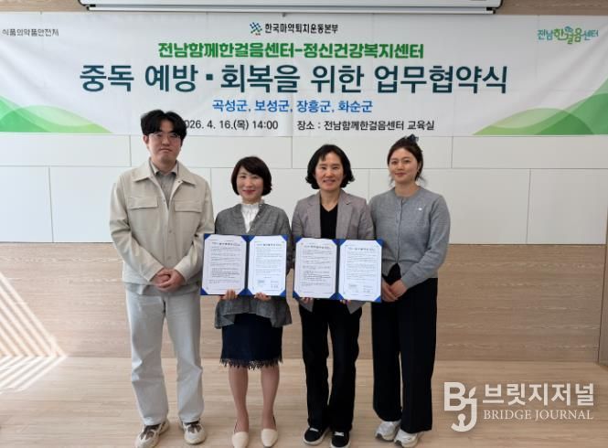 브릿지저널 김경미 기자 | 화순군은 지난 16일 화순군정신건강복지센터가 전남함께한걸음센터와 지역사회 마약류 및 약물 오남용 예방과 회복 지원 강화를 위한 업무협약(MOU)을 체결했다고 밝혔다.