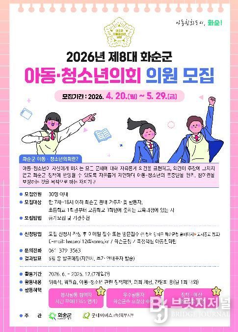 브릿지저널 김경미 기자 | 화순군은 ‘2026년 제8대 화순군 아동·청소년의회’ 의원 30명을 오는 4월 20일부터 5월 29일까지 공개 모집한다고 밝혔다.
