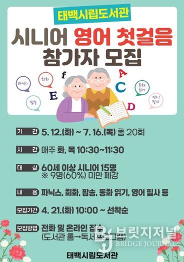 브릿지저널 윤나영 기자 | 태백시는 영어가 두려운 60세 이상 시니어를 대상으로 파닉스부터 시작하는 쉽고 재미있는 ‘시니어 영어 첫걸음’ 프로그램을 운영한다고 밝혔다.