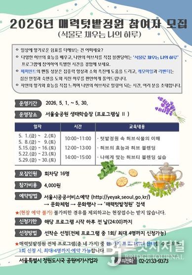 ‘매력텃밭정원’ 프로그램의 자세한 일정과 내용은 서울특별시 공공서비스예약을 통해 확인할 수 있으며, 각 프로그램 시작 2주 전 월요일부터 선착순 신청할 수 있다.