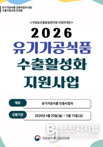 브릿지저널 김경미 기자 | 국립농산물품질관리원은 국내 유기가공식품의 해외 시장 진출을 돕기 위해 20일부터 ‘2026년 유기가공식품 수출 활성화 지원사업’을 추진한다고 밝혔다. 해외 시장 진출에 어려움을 겪는 유기가공식품 인증사업자들에게 수출 준비부터 해외 구매자 연결까지, 맞춤형 지원을 제공해 판로 확대에 기여할 것으로 기대된다.