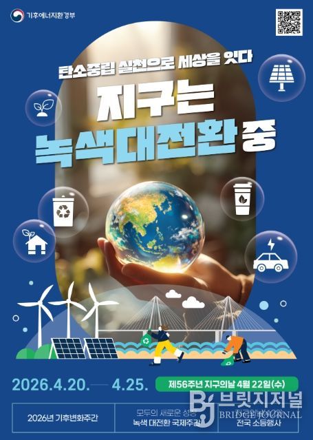 브릿지저널 김경미 기자 | 기후에너지환경부는 지구의 날(4월 22일)을 맞아 4월 20일부터 24일까지 ‘2026년 기후변화주간’을 개최한다. 올해 기후변화주간은 ‘녹색대전환 국제주간(4.20~4.25)’과 연계되어 국제사회의 탄소중립 기술과 정책, 국민의 일상 속 기후행동 실천이 함께 어우러지는 탄소중립 실천문화 확산을 위한 참여와 공감의 장이 마련될 전망이다.