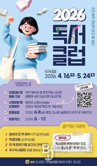 브릿지저널 김경미 기자 | 전남대학교가 지역사회 내 책 읽는 문화를 확산하고 공동체 소통을 활성화하기 위해 오는 5월 24일(일)까지 ‘2026 독서클럽’ 참여자를 모집한다.