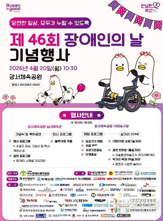 브릿지저널 윤나영 기자 | 부산시는 오늘(20일) 오전 10시 30분, 강서체육공원 실내체육관에서 장애인에 대한 이해를 높이고 장애인과 비장애인이 함께 공감하는 장을 마련하기 위해 '제46회 장애인의 날 기념행사'를 개최한다고 밝혔다.