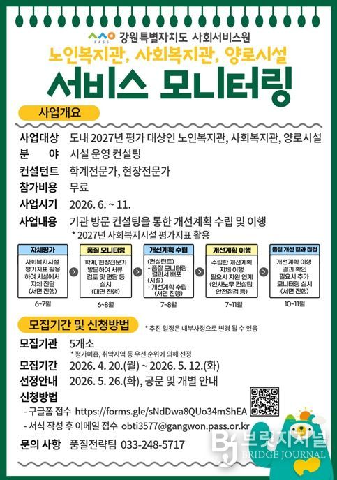 브릿지저널 윤나영 기자 | 강원특별자치도 사회서비스원은 도내 사회복지시설의 서비스 품질 향상과 사회서비스 품질 표준화 체계 구축을 위해 오는 6월부터 ‘서비스 모니터링’ 사업을 추진한다.