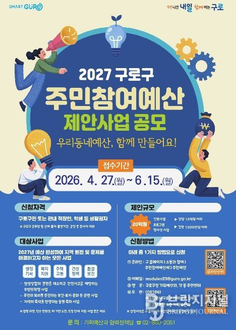 브릿지저널 김경미 기자 | 구로구가 2027년 예산에 편성할 ‘주민참여예산 사업 공모’를 4월 27일부터 6월 15일까지 진행한다.
